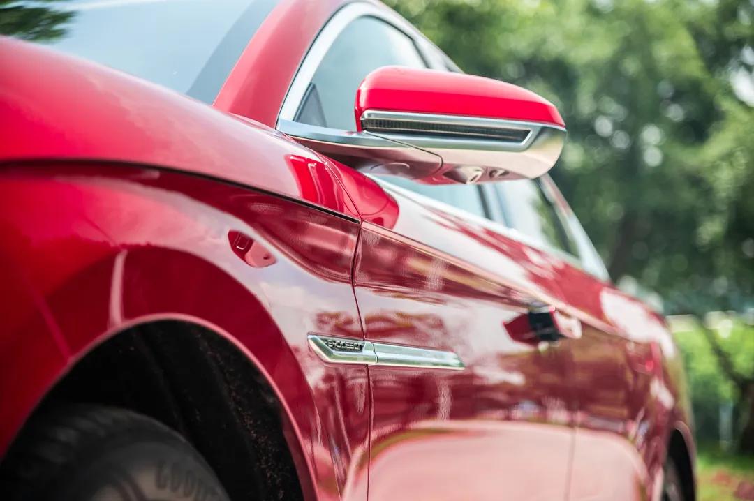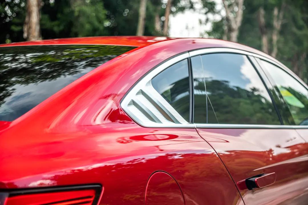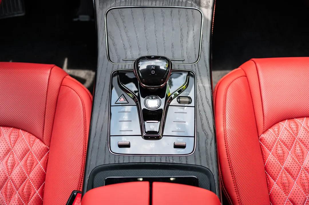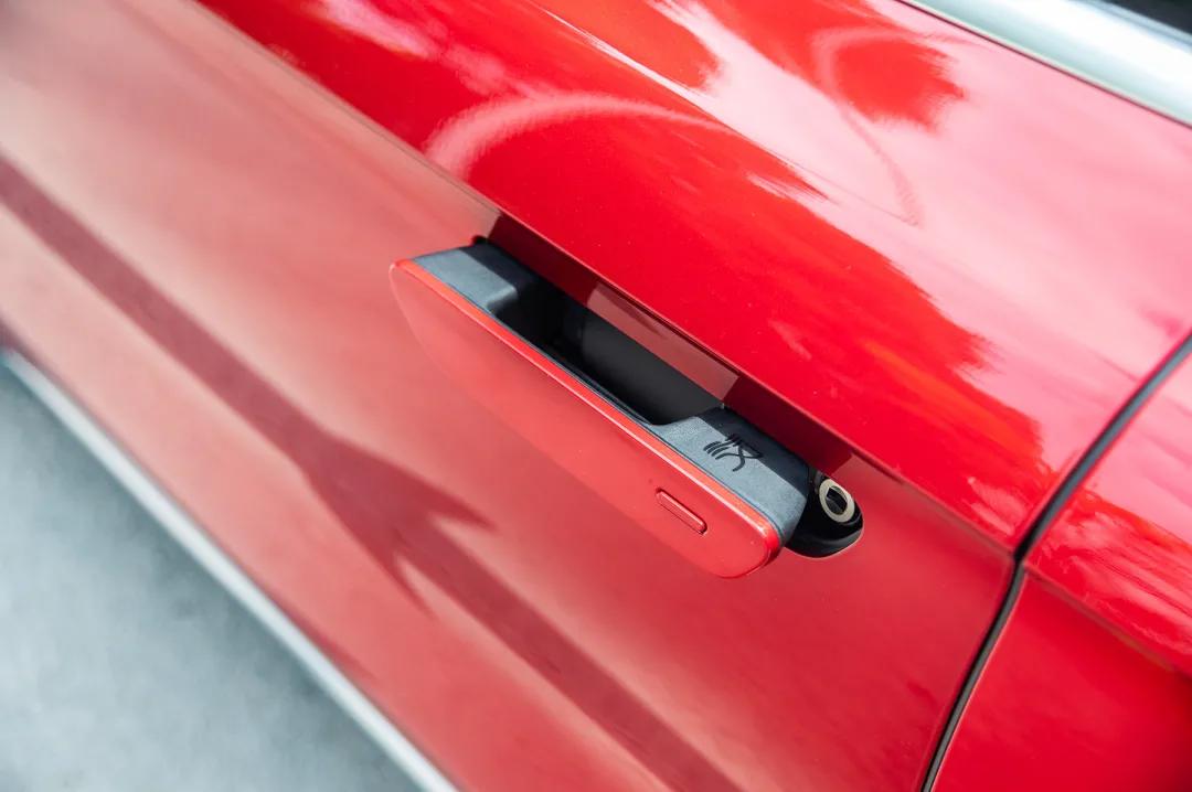 按下解锁按键,缓缓伸出的隐藏式门把手充满了仪式感,而在门板手伸出来之后还能看到篆书简体“汉”,细节做得相当出色。