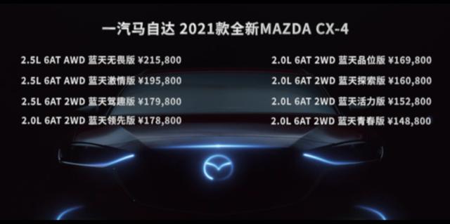 2020年8月15日,一汽马自达2021款全新MAZDA CX-4通过网络直播的方式正式上市。新款车型实现了科技安全装备的全方位升级,共推出8款车型,售价区间为14.88-21.58万元。
