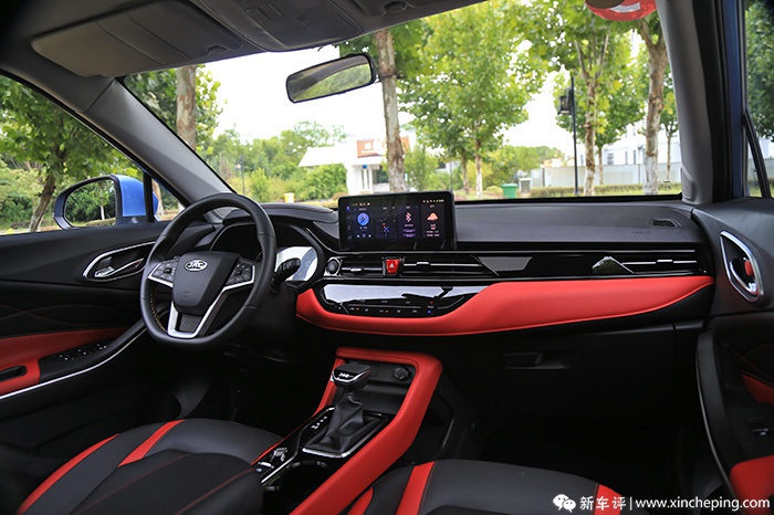 内饰虽然没有外观那么个性,但也质感十足。这里的质感并不是说它的用料有多高级,实际上除了红黑色的皮质以外,其他基本都是硬塑料。但它呈现出来的整体视觉效果还挺高档的(在这个级别来说),尤其是红色的皮质,其实红色很容易变汽配城风格,但江淮的调色显然很克制,有点像玛莎拉蒂的蓝色,别人用就很Low,他们自己调得就很高级。