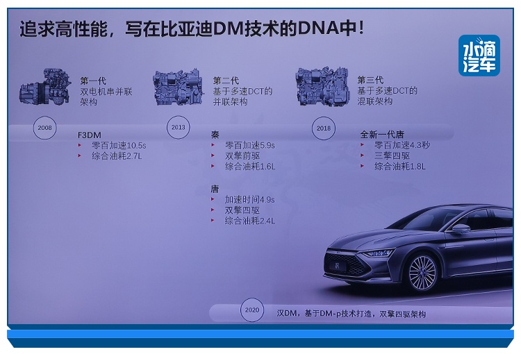 搭载基于DM 3.0优化升级而来的最新DM-p插电混动技术,汉 DM的动力系统由一台2.0T全铝发动机和高电压、高转速、高效率的BSG电机、驱动电机组成,匹配的是6速湿式双离合变速器,额定功率高达321千瓦、峰值扭矩650牛米,0-100公里/小时的加速时间仅4.7秒。