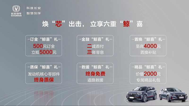 此外,长安汽车官方还针对两款新车推出了焕“芯”出击,立享六重“鲸”喜优惠活动,包括订金“鲸喜”礼:500元订金立抵5000元;金融“鲸喜”礼:二成首付,三年零息;置换“鲸喜”礼:至高4000元置换补贴;质保“鲸喜”礼:发动机核心零部件终身质保;救援“鲸喜”礼:终身免费道路救援;精品“鲸喜”礼:价值2000元专属精品礼包。