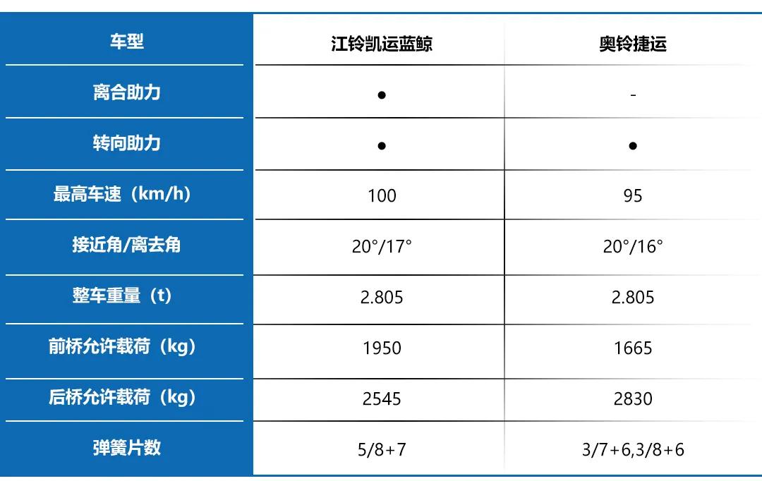 其次,两款轻卡的整车重量都是一致的,但是江铃凯运蓝鲸的允许载荷分布更加均衡一些,而且其弹簧片数也更多,整车的刚性越大,对整车的操控有不少的提升。