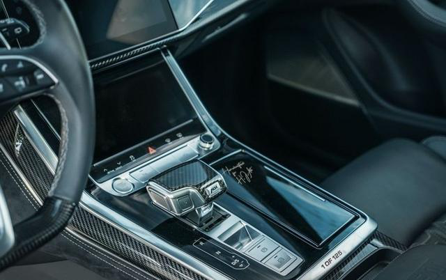 内饰方面,车内内饰采用了大量的碳纤维面板,提升车内的战斗气息。值得一提的是,进行了削平处理的三幅式多功能碳纤维方向盘底部有ABT标识,以彰显其尊贵身份。车内三块超大屏幕带来不错的科技感,中间电子档杆区域可以看到1of125专属徽章,这其实就代表该车型的限量版身份。