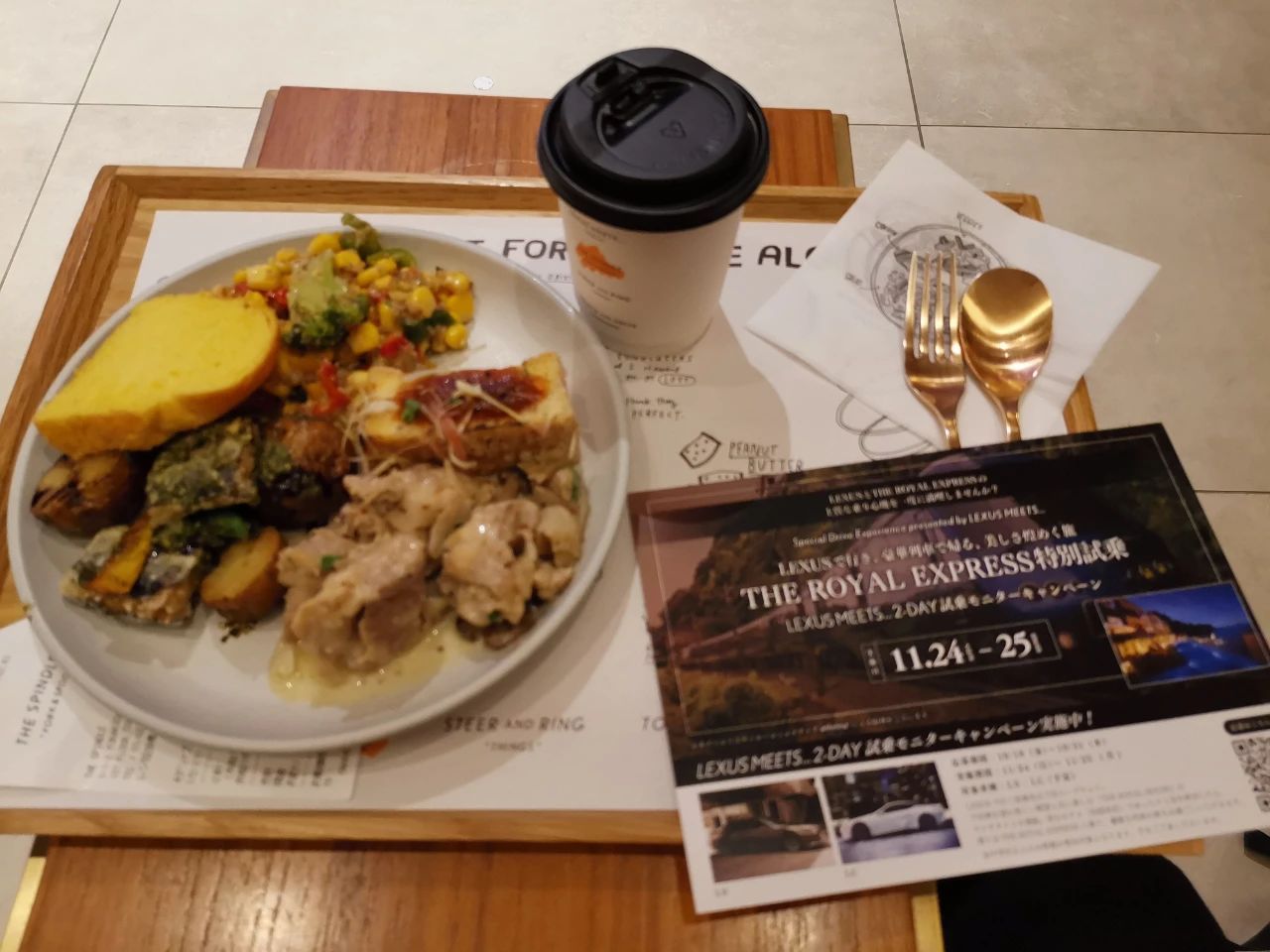 四个小菜有藜麦玉米沙拉,烤土豆,炸豆腐,和一份咖喱牛肉,搭配一小片面包,味道非常不错。买完食物,向左边走是吃饭的区域,也可以点喝的东西。