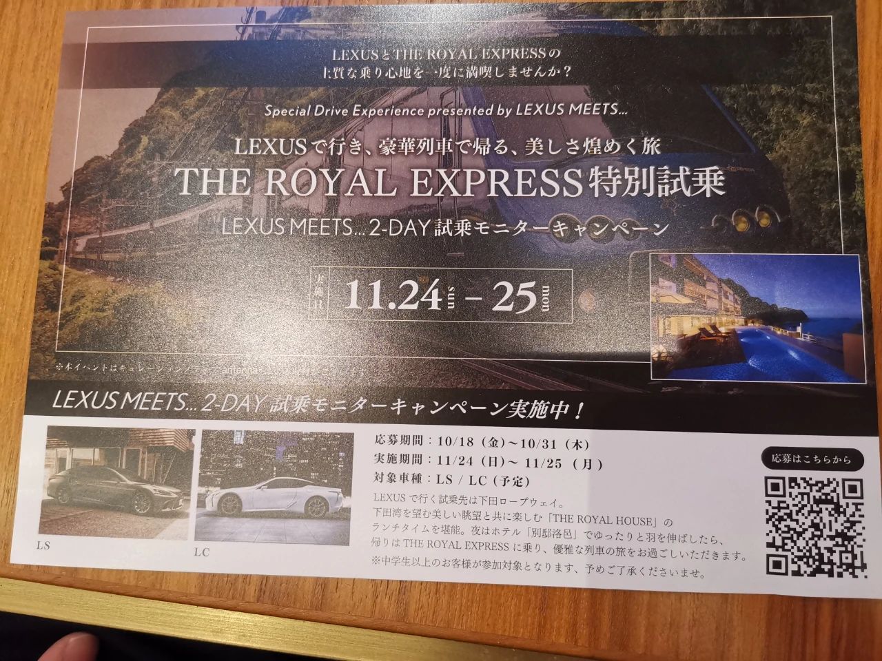 这个短期旅游是2天的行程 - 首先是乘坐高级火车“THEROYAL EXPRESS”号出发,到达位于下田湾的高级酒店“THE ROYAL HOUSE”欣赏美景并住下。接下来便是开着LS (配置|询价)/LC (配置|询价)两款雷克萨斯车型在周边区域自驾体验,随后乘坐火车回来。
