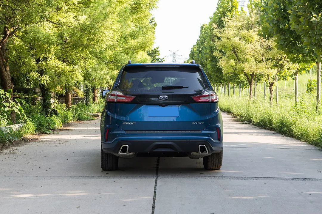 福特锐界车尾造型同样运动气息十足,两侧的后尾灯组之间覆盖了一块黑色的饰板,提升了车尾的视觉宽度,后杠上融入了梯形的双边共两出的排气布局,并在后杠中间设计了一个梯形的造型,提升了车尾的时尚感。