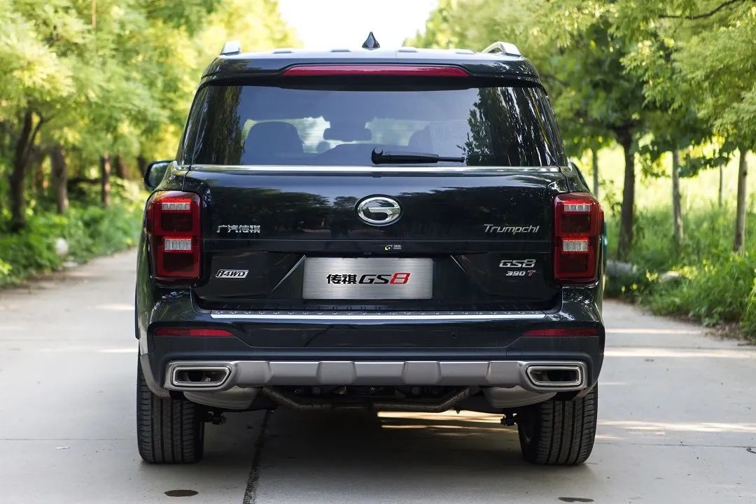 传祺GS8的车尾换装了全新设计的后保险杠,后杠下部采用银色护板全包的设计,并将双边共两出布局的梯形排气融入其中,有效提升了车尾的整体感和精致感。