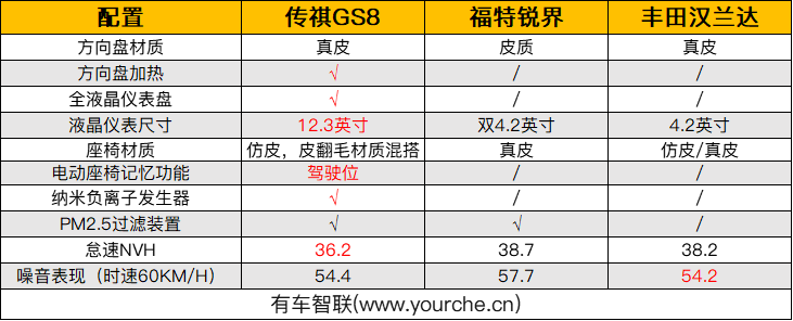 从车内配置对比可以看出,传祺GS8比福特锐界和丰田汉兰达更加丰富,此外,根据我们此次实测三款车型的车内NVH来看,GS8的综合NVH表现最好。由此看出,GS8更丰富的舒适性配置,和更好的车内静谧性能使其驾乘感觉更为舒适。