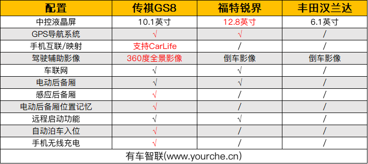 从科技配置对比可以看出,GS8的配置最丰富,锐界的配置适中,汉兰达的配置最少。GS8在智能化配置上十分丰富,使消费者在日常驾驶中有很好的便利性,更利于操作。