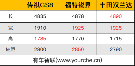 从三款车型的车身尺寸来看,传祺GS8的车身高度最高,福特锐界的轴距最长,福特锐界的宽度和丰田汉兰达同为最宽,丰田汉兰达的车身长度最长。总的来说,三款车型尺寸相差的并不多,而传祺GS8更高的车身能够提供更好的头部空间。