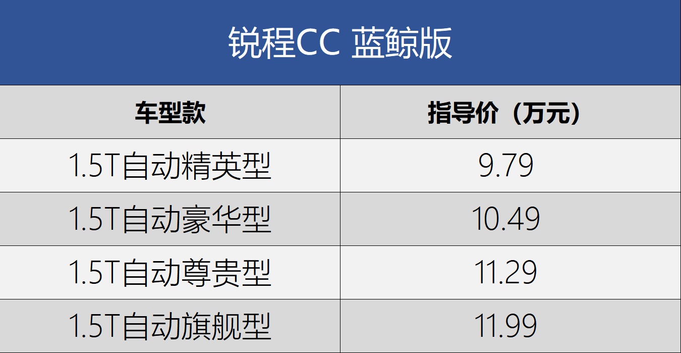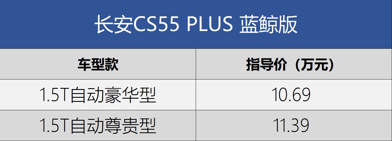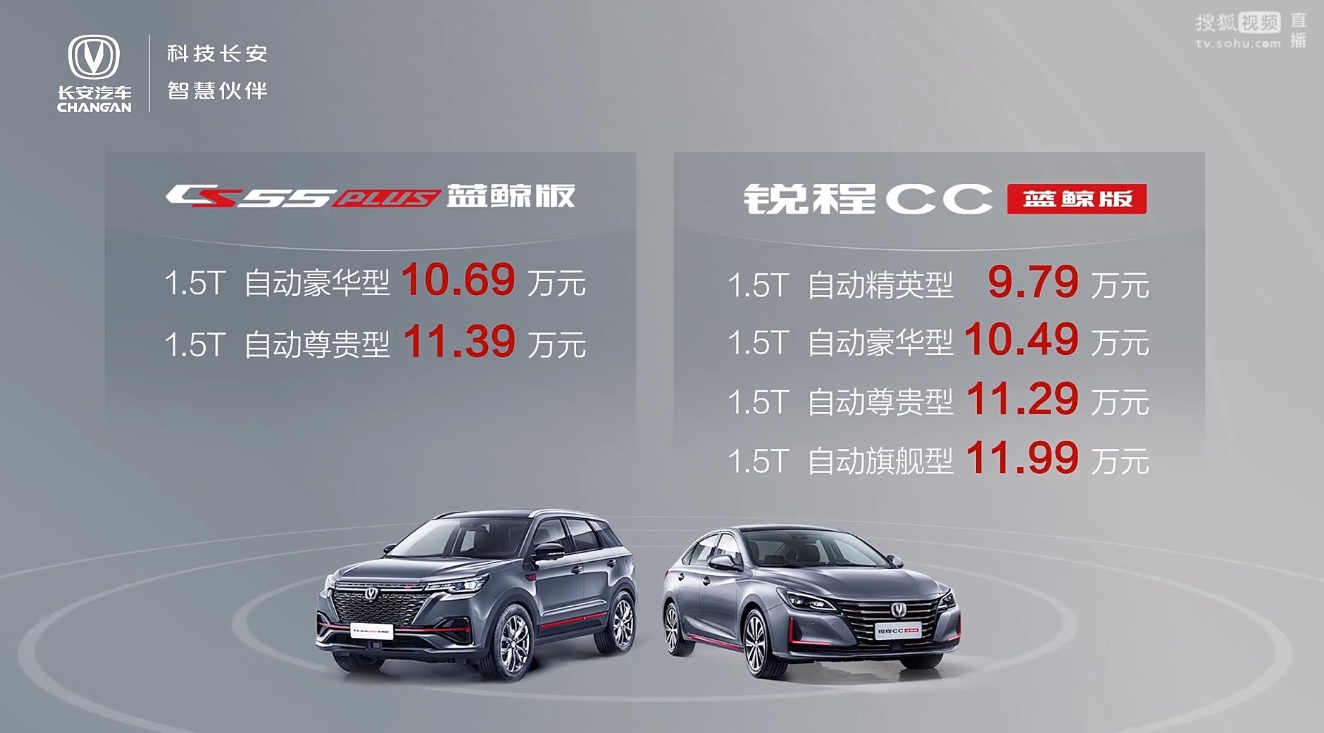 2020年8月17日晚间,长安CS55 PLUS (配置|询价)蓝鲸版以及锐程CC蓝鲸版正式上市。长安CS55 PLUS蓝鲸版共推出2款车型,官方指导价区间为10.69-11.39万元;长安锐程CC蓝鲸版共推出4款车型,官方指导价区间为9.79-11.99万元。蓝鲸版车型与普通版车型最大的不同是搭载了蓝鲸NE 1.5T发动机,在性能参数上相比老款1.5T发动机有了不小的提升。