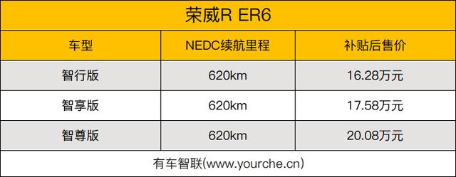 荣威R ER6是荣威品牌启用双标战略以后,R标旗下推出的首款量产车型。该车全系车型的NEDC续航里程均达到了620km,早期共推出3款配置车型,补贴后售价区间为16.28万-20.08万元。作为一款搭载新标识的纯电动车型,该车也采用了全新专为纯电动车型开发而来的集智设计理念打造而来,所以也能够比较明显看到它与以往的荣威纯电动车型以及燃油车型的不同。