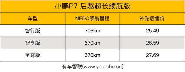 我推荐这款小鹏P7的原因主要是它是目前市面上续航最高的一款纯电车型,其后驱超长续航版车型的NEDC续航里程达到了706km,补贴后售价也只需25.49万元,足以让我们彻底告别里程忧虑。与国产特斯拉Model 3相比,二者不仅车型定位相同,就连售价也有着很大一部分的重叠,但是在综合实力方面,小鹏P7还是有与特斯拉Modle 3一拼的实力的。