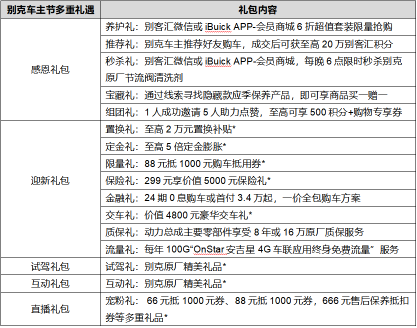 此外,用户可通过别克官方微信公众号、别克官方微博、天猫上汽通用别克官方旗舰店等渠道,关注“别克车主节”期间的多场线上直播,参与互动并解密“宠粉福利”,还有机会获得66元抵1000元购车券、88元抵1000元购车券、666元售后保养抵扣券和多重礼品,享受“有特权 别克制”的精彩嘉年华。