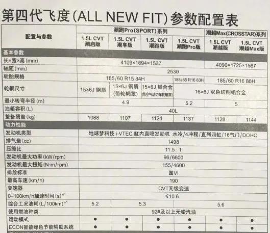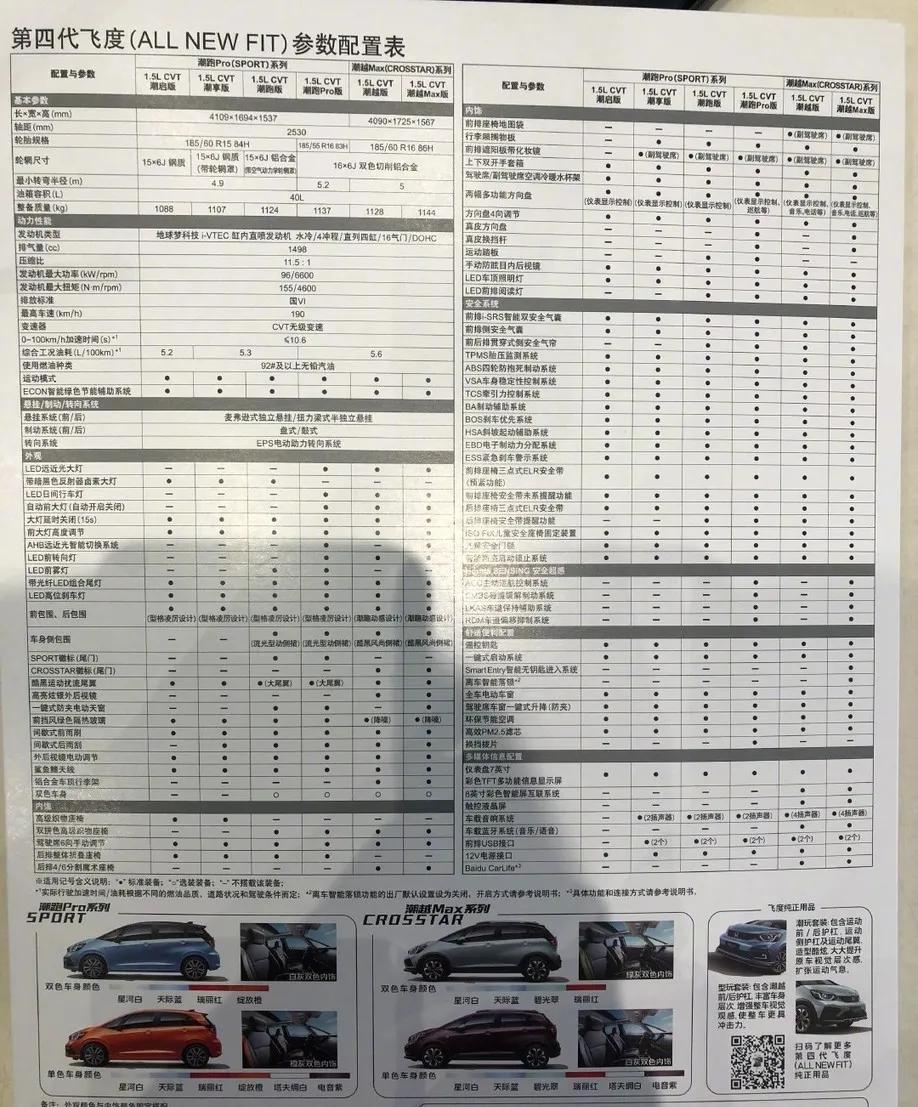 从网上流传的配置图来看,全新飞度共有潮跑(Sport)和潮越(Crosstar)两个系列共6款车型并全部采用了1.5L+CVT的动力组合,也就是说即使是最低配版本,也不会出现手动版本了,那些说想要买手动挡的买家可能会失望了。