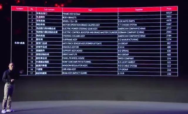 我们首先来看第一点:广汽蔚来成为首个公开BOM单的车企。BOM单,Bill of Material,意为物料清单。一个合格的BOM单应该具有系统、配件、供应商、成本价格等信息。而广汽蔚来将这些信息列好表,在发布会上全部公开。