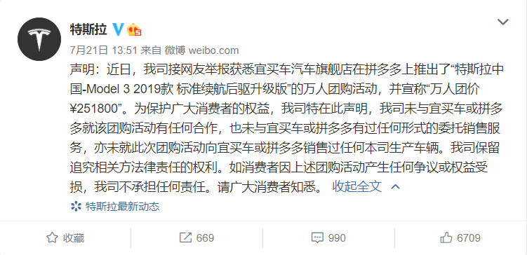 随后特斯拉官方发布声明称,特斯拉并未与拼多多和宜买车有任何合作,并且以违反了转卖条款的规定,拒绝向已经付款的车主交付车辆。