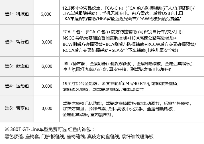 除了丰富的标配配置外,起亚还为全新K5提供了极为丰富且便宜的选装包,用来满足用户对于配置的个性化需求。例如带有12.3寸液晶仪表、手机无线充电以及全套驾驶辅助系统的选装包仅需6000元。而19英寸轮圈、245/40 R19米其林轮胎,前排座椅加热通风,选装包更是仅需3000元!真是不选都觉得亏啊......