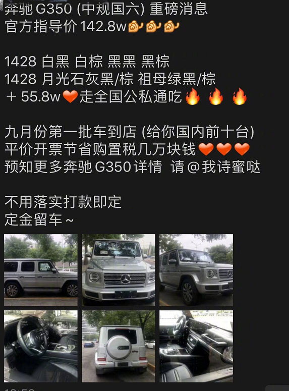 至于大家关心的售价方面,G350虽然发动机只是2.0T,但是价格可不便宜。根据某车商的朋友圈截图来看,G350的报价为142.8万元,并且还需加价55.8万元,相当于裸车逼近200万了!不过,考虑到目前G500加价后落地要300万,G63落地接近400万,似乎G350这个价格也在意料之内了。对此也有网友戏称,花200万买了个G350,开出门还要被人讽刺没钱装X。