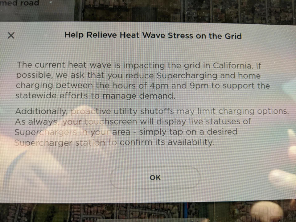 最近有国外的特斯拉车主在车机中收到了来自特斯拉的推送消息,大致内容是:由于美国加州近日正经历极端炎热天气,电网供电压力大,建议各位特斯拉车主尽量减少在下午4点到晚上9点之间给车辆充电。