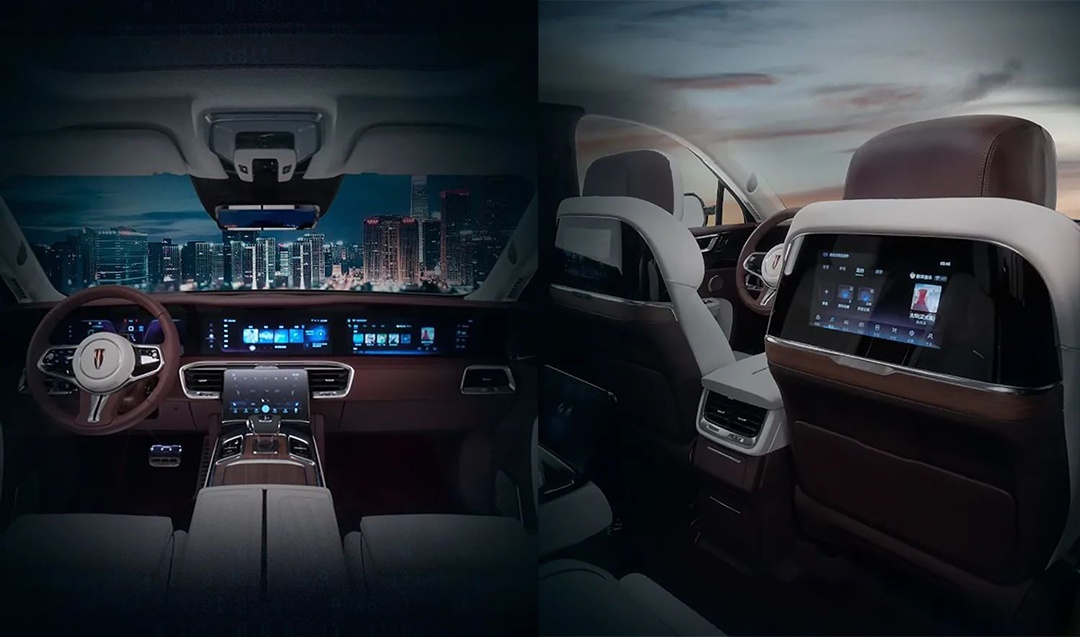 车内前排将配备有4块屏幕,并搭载新一代红旗智联系统。后排除了两块娱乐屏幕外,中央扶手上也将配备有一块控制屏幕,整车最多将配备有7块屏幕。