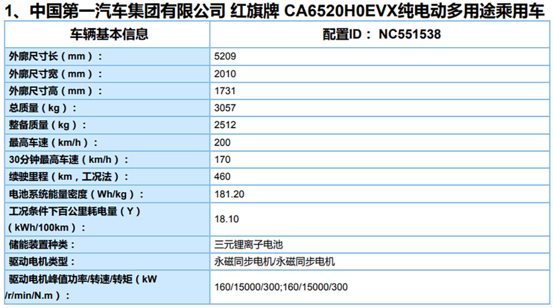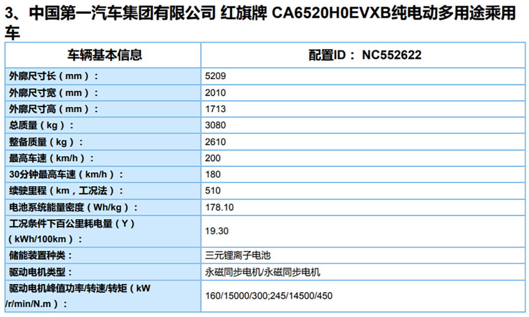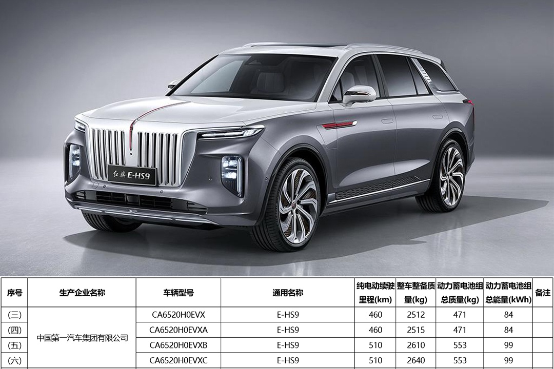 日前,在国家工信部最新公布的第三十四批免征车辆购置税的新能源汽车车型目录中,我们获取到了有关于红旗E-HS9 (配置|询价)车型的电池组容量及工况续航信息。