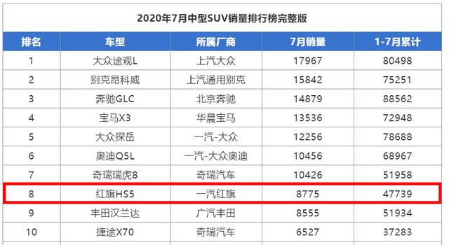 作为国产中型SUV里崛起最快以及最被认可的豪华中型SUV,红旗HS5 (配置|询价)如今可谓是得到了众多消费者的认可。在7月,红旗HS5再次以8775辆的销量成绩排在了中型SUV销量榜的第八位,今年1-7月,其也总共卖出了47739辆的销量数据。可以说,红旗HS5的出现间接使得国产中型SUV登上了一个新高度,这其中既是国人支持国车的自觉举动,也是国产车在技术实力与颜值上所取得的巨大进步。