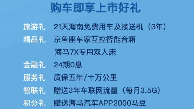 2020年8月23日,海马7X以12.58万元-14.98万元的售价正式上市,新车拥有超大三排空间,专注儿童安全的“二胎七座车”海马7X,本次共推出自动旗舰型(定制)、自动豪华型、自动精英型三款车型。此外还给用户带来了六重上市好礼,不仅涵盖金融、服务等多项常规礼,还特别推出了旅游礼,三年内21天海南免费用车(含接送机)。