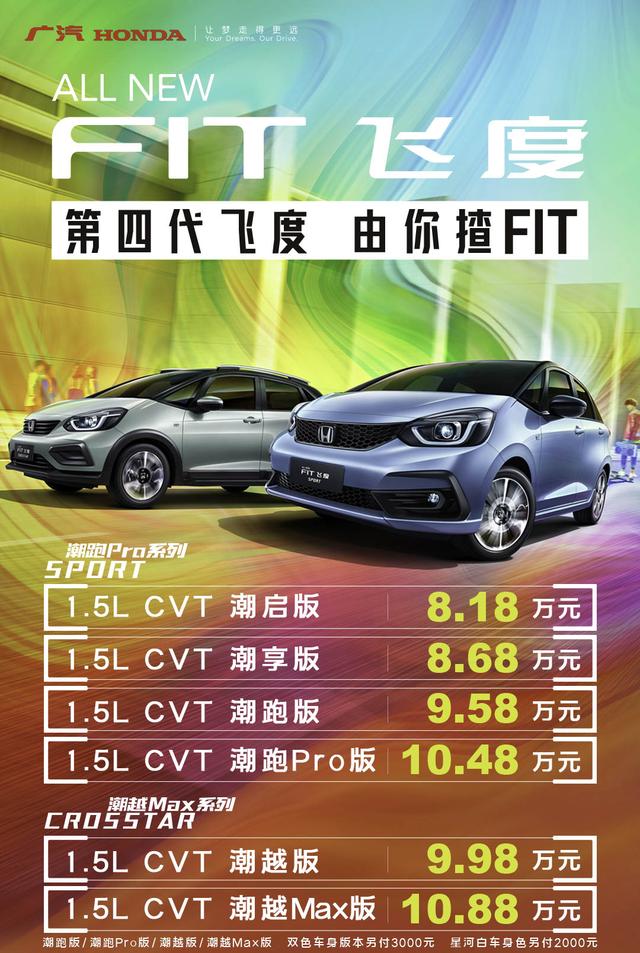 8月26日,一代神车本田飞度 (配置|询价)终于换代上市,新车取消手动版本,全系采用1.5L+ CVT,并推出潮跑Pro(SPORT)和潮越Max(CROSSTAR)两个系列共六款车型。售价8.18-10.88万元。