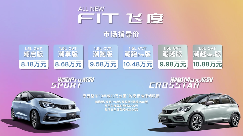 8月26日,广汽本田第四代飞度 (配置|询价)(FIT)举行了线上上市发布会,售价8.18-10.88万元,分为潮跑Pro(SPORT)系列和潮越 Max(CROSSTAR)两种版本车型,为消费者带来了更为精准的产品区分。