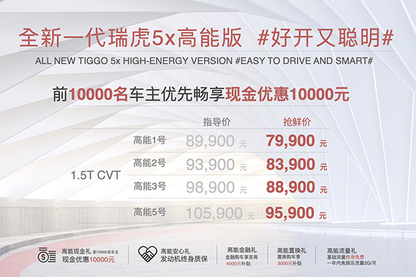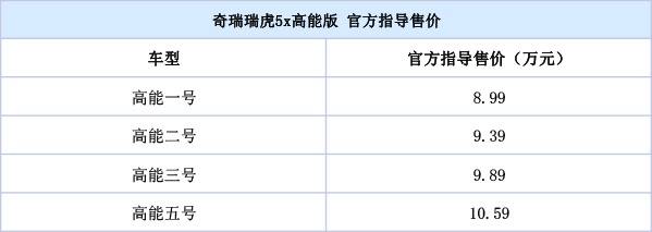 2020年8月26日,奇瑞汽车宣布新款瑞虎5X (配置|询价) 1.5T高能版车型正式上市。据悉,新款瑞虎5x 1.5T高能版为瑞虎5x的中期改款车型,整车主要在造型、内饰设计、动力以及相关配置部分进行了重新设计及优化;此外,在人车智能交互上也进行了升级。在本次上市发布会中,新款瑞虎5x 1.5T高能版共推出4款车型,售价区间为8.99-10.59万元。在此之上,奇瑞宣布前10000名车主可以享受10000元的现金优惠,即7.99-9.59万元。详细车型售价,请看下表: