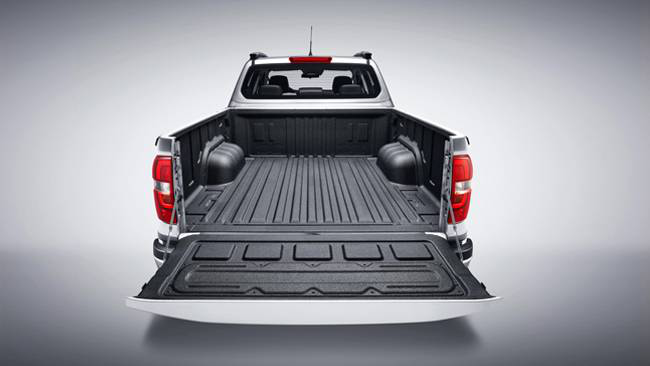 外观方面,新车前脸采用大嘴式前进气格栅,内部采用横幅式镀铬饰条装饰,整体设计非常硬派。同时搭配上两侧前大灯组,凸显整体感。下方的保险杠很有质感,两侧的雾灯造型犀利,增加了几分精致。尺寸方面,新车长宽高分别为5330/1930/1835mm,轴距为3180mm,货厢内宽1595mm,保证了皮卡的装载能力。同时,该车还配备了18英寸轮圈。