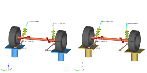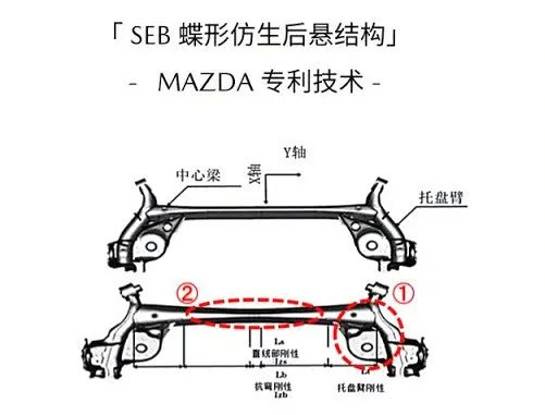 畅想过后,我们回归现实。其实大家都知道,上述那种材料目前是做不出来的。于是,马自达的工程师就把研发重心放在了“钢管”的直径上。最终,它们通过使用变径“钢管”(在上图红圈2的地方收窄)有效提高了“钢管”的变形极限,从而将两侧车轮相互干涉的程度降到了最低,这便是所谓的“马自达SEB蝶形仿生悬架”。