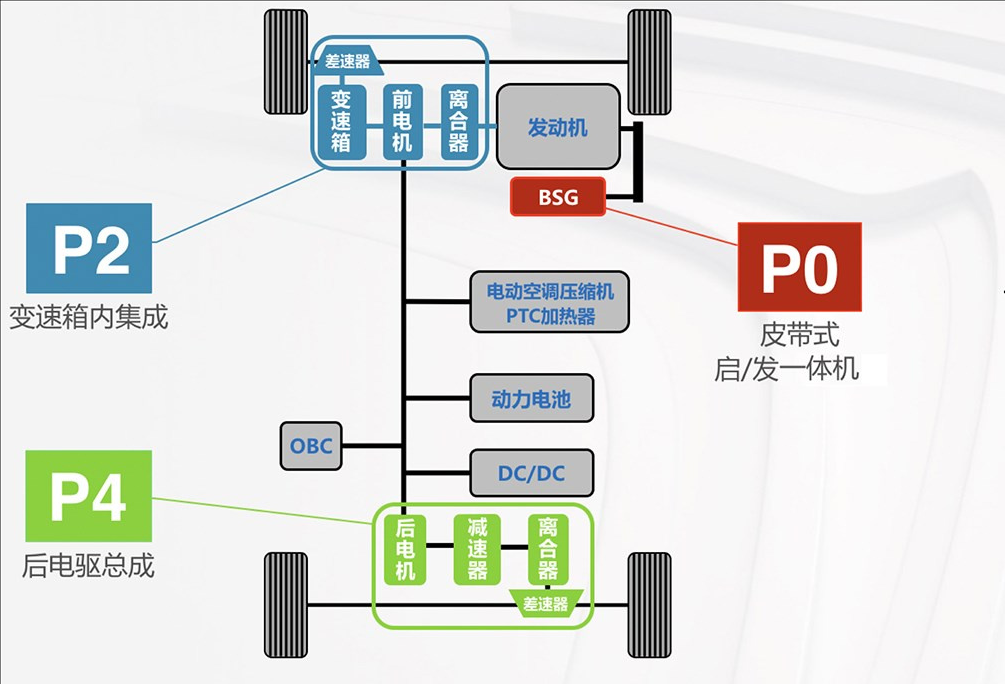 何为“P0+P2+P4”三电机架构?简而言之,P0架构即BSG(皮带式发电/启动一体机),其位于发动机附件面,可启动发动机,也可给蓄电池充电。这样的好处是可以让发动机的启动更加顺畅平稳,还可以给蓄电池充电,减轻其负荷。