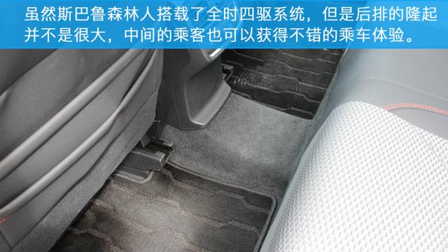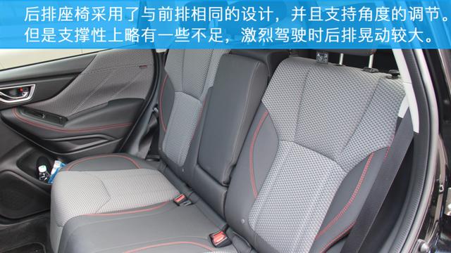 斯巴鲁森林人的座椅采用了织物与真皮相结合的方式,整体乘坐感受非常舒适,前排座椅的支撑性很好。但是,后排在支撑性上略有些不足,在激烈驾驶时的晃动比较明显。虽然斯巴鲁森林人为全时四驱车型,但是后排的地台并不是很高。所以后排中间的乘客也可以获得不错的乘坐空间。