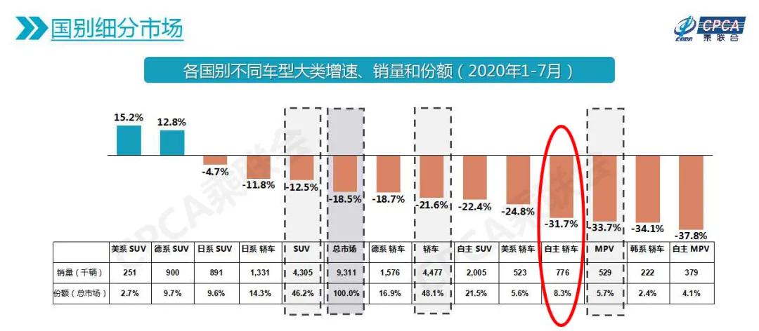 虽说在上述数据当中,中国轿车市占率可以排行第三,领先美系、韩系以及徘徊在生死边缘的法系,但从市场增速方面来看,今年1-7月份中国轿车的市场增速(-31.3%)远低于轿车大盘(-21.6%)以及主流合资轿车(-22.7%),再考虑到韩系开始凭借第十代索纳塔和全新凯酷 (配置|询价)强势发力,情况其实并不容乐观。