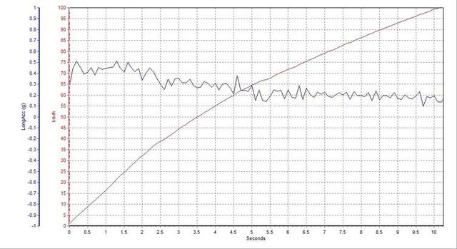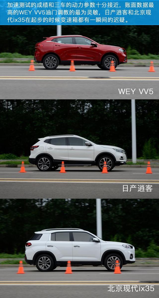 加速测试的成绩和三车的动力参数十分接近,账面数据最高的WEY VV5油门调教的最为灵敏灵敏,因为起步反应也是最快的,中段加速能力同样最出色,10.14秒的加速成绩比另外两台车都快了不少。日产逍客和北京现代ix35在起步的时候变速箱都有一瞬间的迟疑,随后动力才爆发出来,成绩上也受到了一定的影响。最终日产逍客和现代ix35的百公里加速时间为10.79秒和11.01秒。
