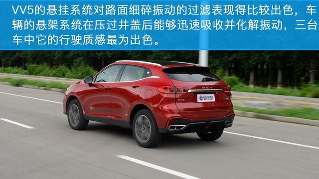 VV5 1.5T则采用前麦弗逊式独立悬架和后双横臂式独立悬架,整体的调校偏向家用舒适性,对于路面细碎振动的过滤表现得比较出色,车辆的悬架系统在压过井盖后能够迅速吸收并化解振动,三台车中它的行驶质感最为出色。