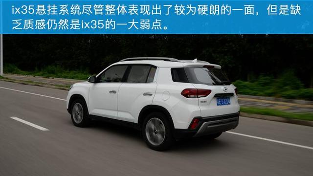 ix35悬挂系统尽管整体表现出了较为硬朗的一面,但是缺乏质感仍然是ix35的一大弱点,尤其是在通过减速带或者井盖等路面接缝时,这种车身反馈的单薄感比较明显,它虽然“整”但是不够厚重。而在滤震性上悬挂系统的表现还算不错,基本可以过滤掉路面细碎的震动。