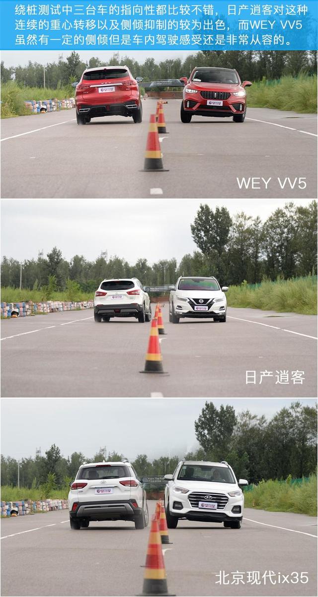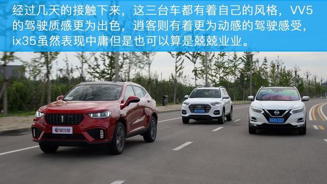 经过几天的接触下来,这三台车都有着自己的风格,VV5的驾驶质感更为出色,逍客则有着更为动感的驾驶感受,ix35虽然表现中庸但是也可以算是兢兢业业。动力部分由于VV5采用了涡轮增压发动机,所以它的扭矩是三台车中最大的,低速起步时可以带来较为明显的推背感,而在中段加速时动力响应也绝对没问题,而且它配备的7速双离合变速箱换挡也非常的平顺。