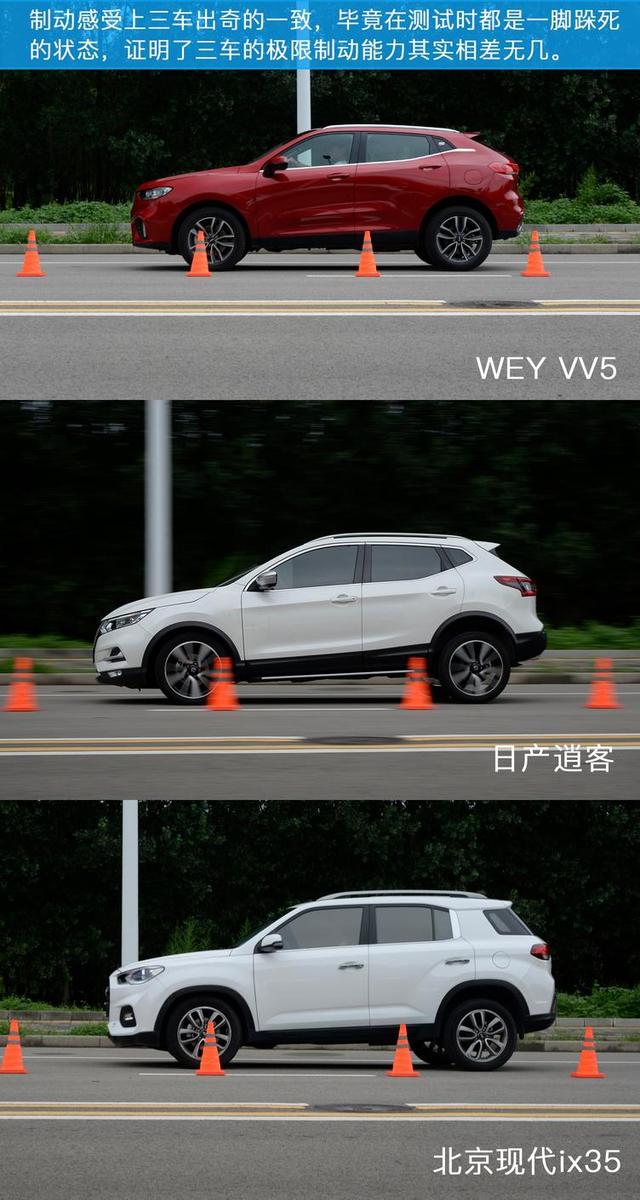 制动感受上三车出奇的一致,毕竟在测试时都是一脚跺死的状态,证明了三车的极限制动能力其实相差无几。但是在日常驾驶的制动脚感上还是有一些差别,这其中日产逍客的刹车脚感偏硬一些,但整体制动力保持的比较线性,因而很容易就能适应了。北京现代ix35能感觉到制动力很大,但是在踏板反馈的线性上还有一些改进空间,和它的油门踏板一样,对新车主而言需要一些时间去习惯。WEY VV5的刹车踏板回馈相对比较软,油门和刹车踏板间的力度回馈基本一致,并且都很线性,对新手来说是非常友好的设定。最终WEY VV5、日产逍客、北京现代ix35的刹车距离为40.30米、38.75米以及40.68米。