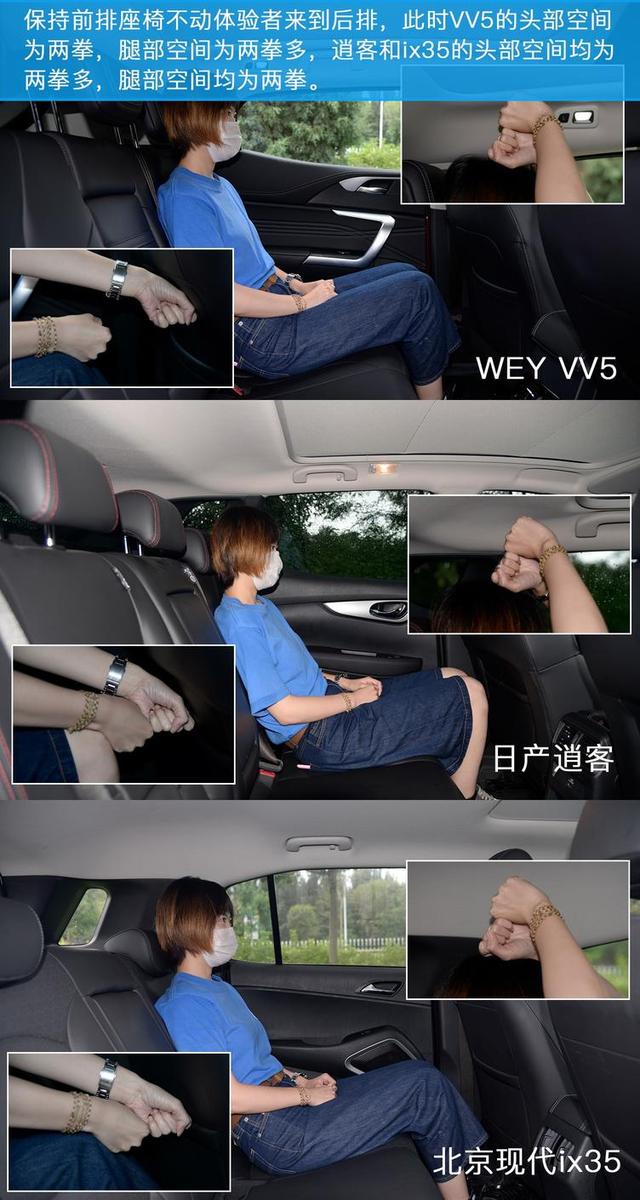 内饰空间总结:VV5的内饰设计采用了大量的软性包裹,并且双12.3英寸的全液晶仪表以及中控液晶屏也可以带来较强的科技感,日产逍客虽然为新车加入了一定的皮革包裹,但是在整体的质感上还是略逊VV5一筹,北京现代ix35的内饰有很强的塑料感,但好在内部的储物空间较为丰富。乘坐空间方面本次试驾的三台车型不分伯仲,后排的乘坐空间上VV5的腿部空间虽然有较为明显的优势,但是头部空间表现一般,逍客和ix35则是头部空间稍有优势但腿部空间表现一般。