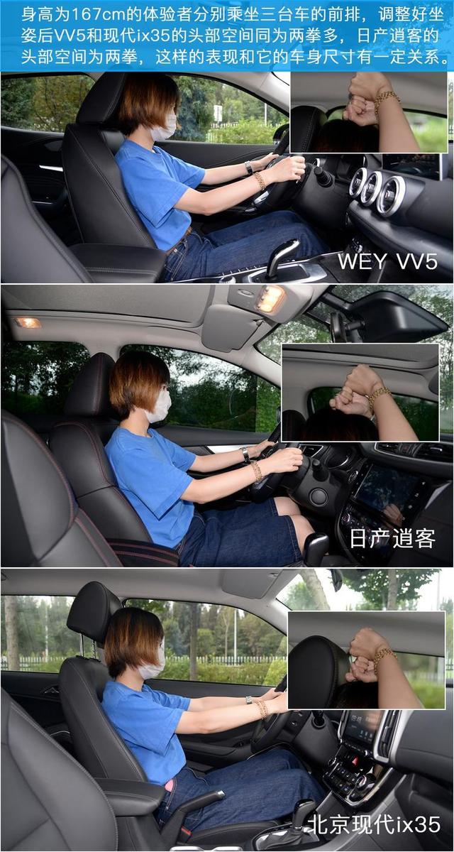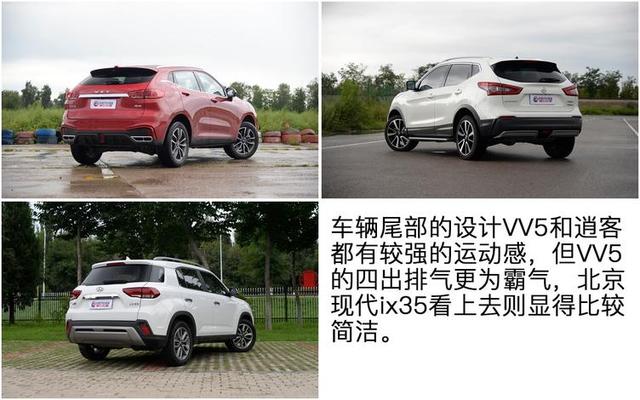 外观总结:本次试驾的三台车在外观方面都有着自己的设计风格,WEY VV5流畅动感的车身线条以及全车LED光源的应用,更符合年轻消费者的诉求,日产逍客作为一名久经沙场的老将已经非常的了解国人的心思了,虽然整体造型没有VV5运动感强,但依旧符合目前的审美潮流,至于北京现代ix35虽然也顺应潮流加入了一些时尚元素,但与另外两台车比还是会有一些中庸。
