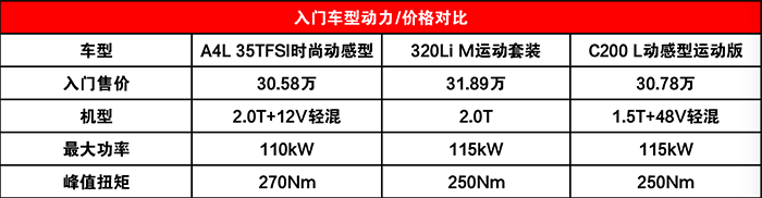 而即便是我们并不怎么推荐的入门动力版本,A4L在动力表现不逊对手(功率接近,扭矩更强)的前提下,也有着最低的价格门槛。不过我们还是更建议各位选择40TFSI车型,毕竟该动力版的价格门槛也不过是31.88万元,相比35TFSI的30.58差距其实相对有限,更重要是仍然低于320Li的31.89万元,属于降维打击。