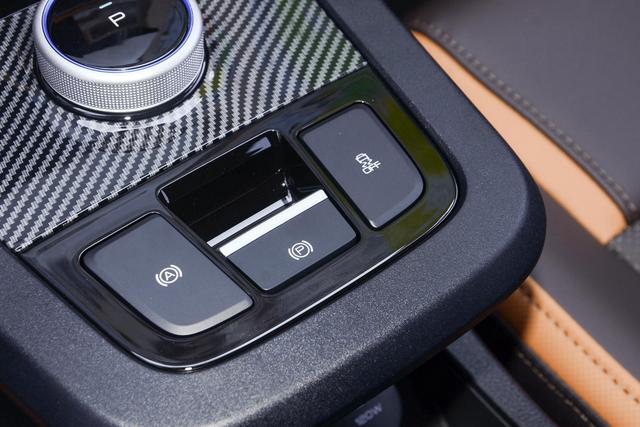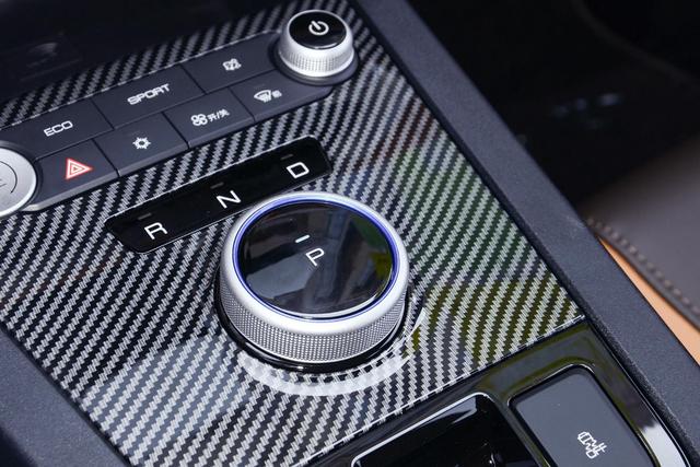 采用旋钮式换挡机构,P挡设置在中间位置,不过旋钮的限位有些模糊,在切换空挡的时候经常会出现误操作。在换挡区域前部还有一个小储物格,同时也是无钥匙启动功能的感应区。