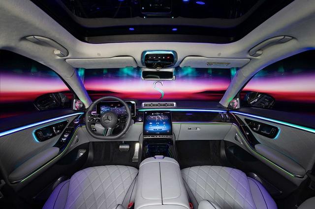 凭借主动式环境氛围灯,梅赛德斯-奔驰首次实现了互动式内饰照明。主动式环境氛围灯包含263个LED光源,照明效果较过去明亮10倍,带来流动绚丽的视觉效果。此外,主动式环境氛围灯还可结合智能驾驶辅助系统、MBUX智能人机交互系统以及“畅心醒神”功能,提供相应的视觉提醒,令光影艺术彰显智能魅力。
