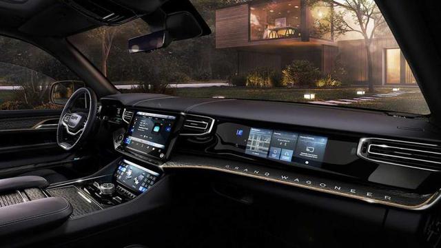 很显然,Grand Wagoneer是一台旗舰车型,定位要高于大切诺基,从本次概念车的发布来看,这台全尺寸SUV在设计、科技方面的表现也更为现代,车内出现了多块大尺寸的液晶显示屏,这其中包含全液晶仪表(12.3英寸)、副驾驶显示屏(10.3英寸)、中控大屏(12.1英寸)、中央下方触控屏(10.3英寸)等等。
