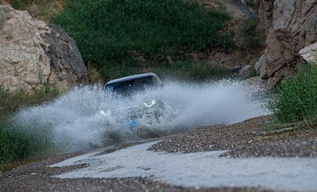 面对交错的丘陵形成天然的交叉轴,此时四个车轮受到的附着力是完全不同的,极限状态下是一对对角的悬架及车轮被压缩到极限,而另外一对对角的轮子完全悬空,在这种情况下,卫士配备的电控机械式中央差速器和主动式后桥差速锁就要发挥作用了。由于车辆的中锁和后锁都是电控的,所以不需要人工开启,当有车轮失去附着力后,系统会在瞬间实施限滑,反应速度非常快,将动力分配给有附着力的车轮,完成脱困。
