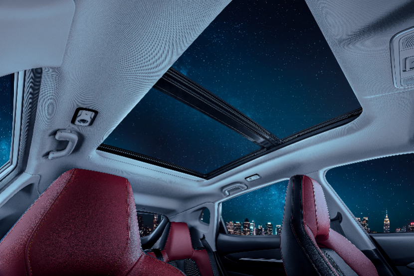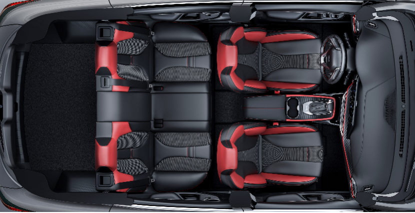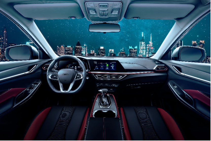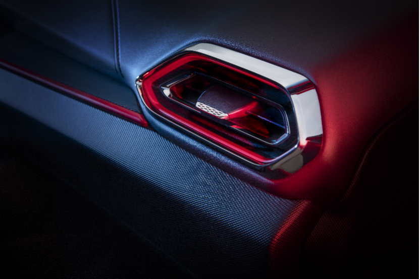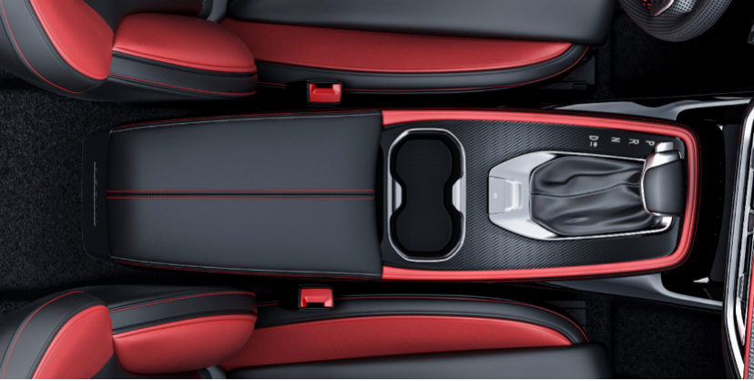 中央扶手区类似一个滑板造型,形式很奇特,而且是悬浮式。空调出风口为回字形,三层镀铬辅以红色内饰点缀,此外在排挡杆、门板内部采用了黑铬处理,相比普通的镀铬件,这种材质更显质感。