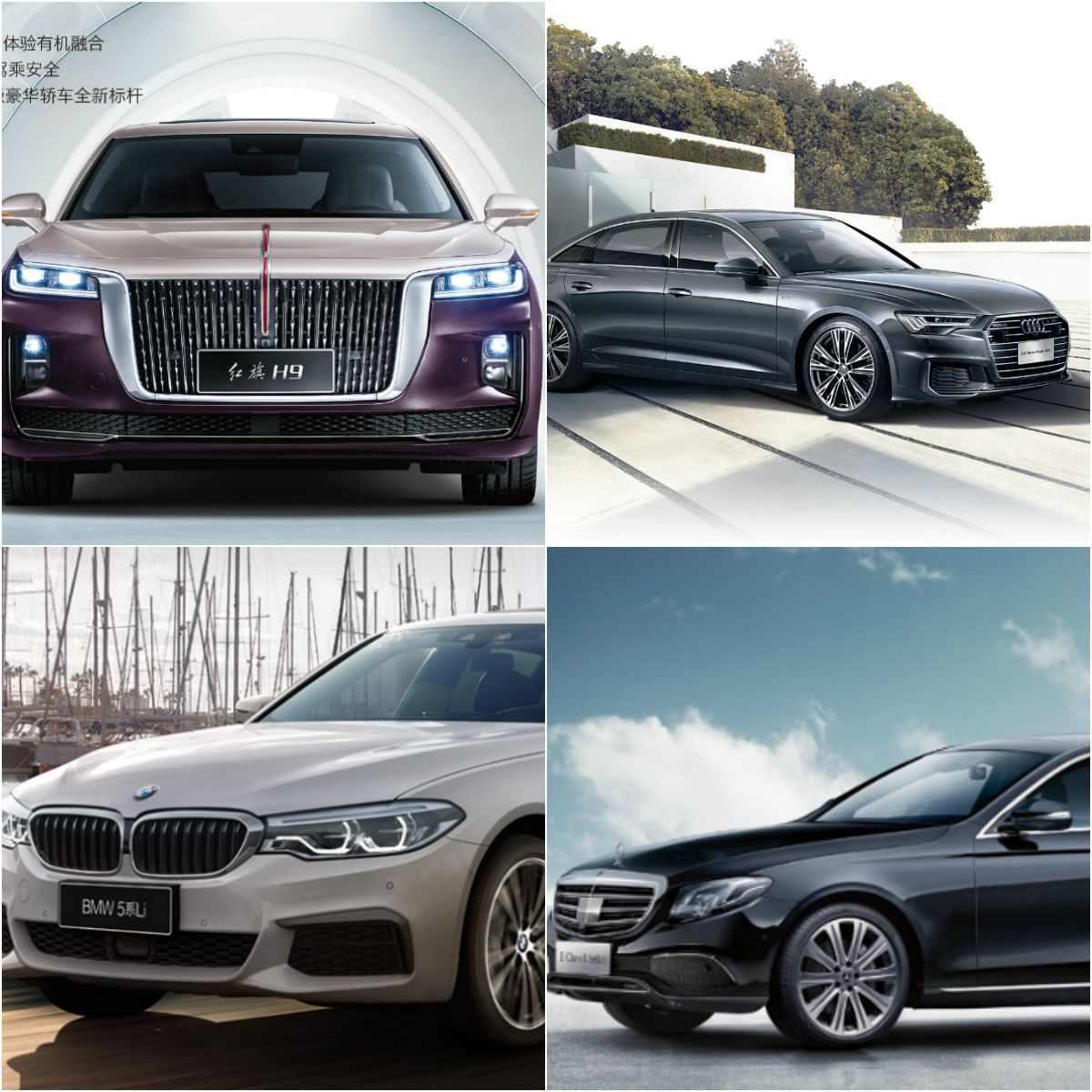 配置层面,分别取各车型关注度最高的进行对比,即红旗H9 2020款2.0T智联旗享版(售32.98万元)、奥迪A6L 2020款45 TFI臻选致雅型(售43.98万元)、宝马5系2020款525Li运动套装(售42.69万元)、奔驰E级2020款 改款E 300 L殊享版(49.98万元)。